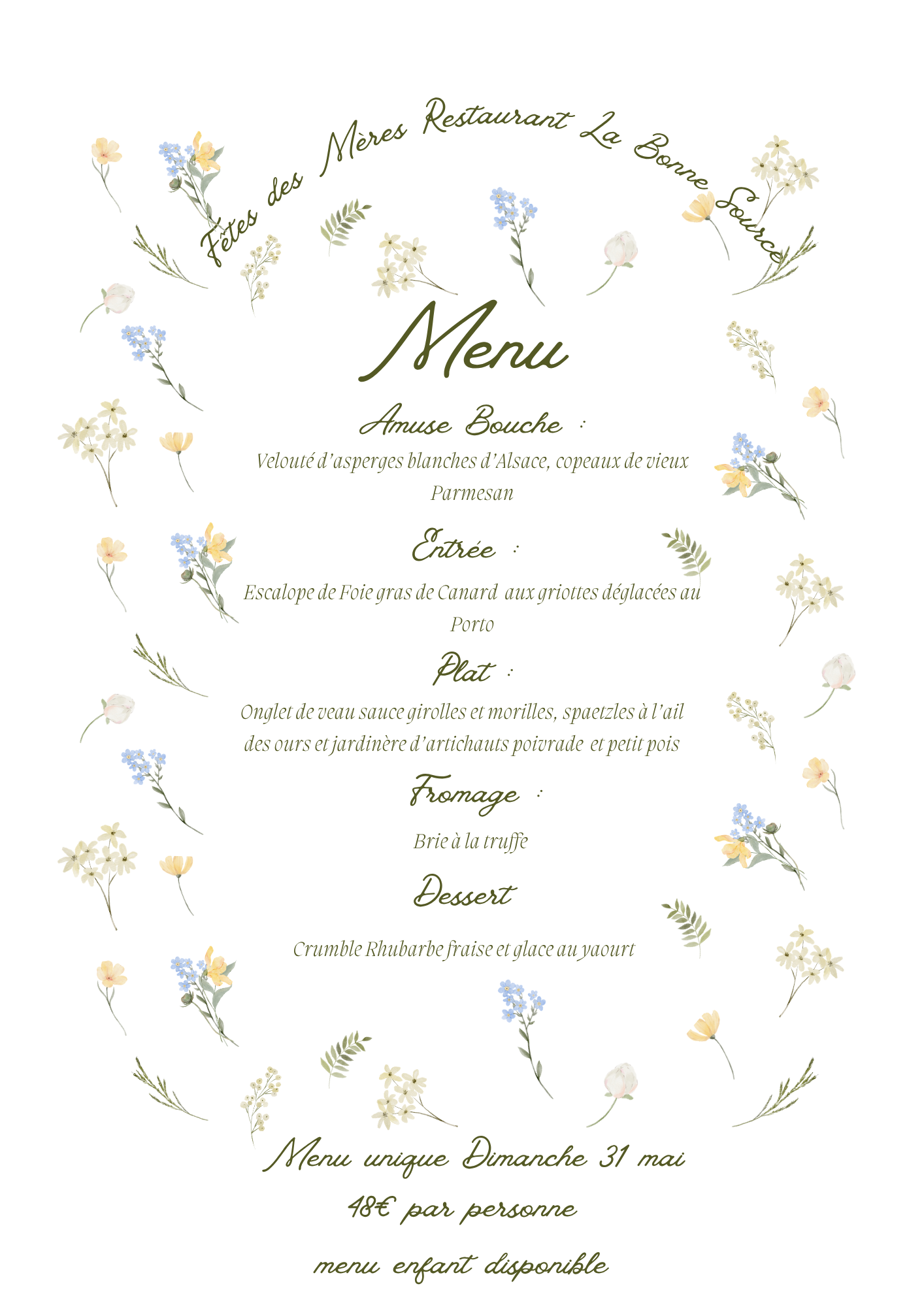 Dimanche 25 mai à l'occasion de la fête des mères le Restaurant La Bonne Source est heureux de vous proposez un menu spécial, élaboré avec des produits frais locaux et fait maison pour célébrer celles qui nous sont les plus chères résa : labonnesource.eatbu.com ou 0388840112